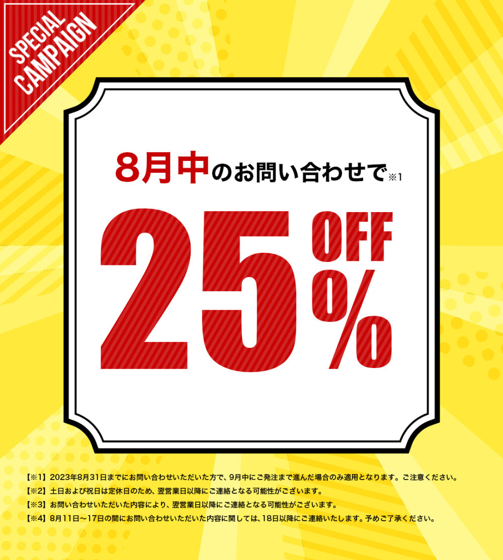 セーノでは、2023年8月中にお問合せいただいたお客様に限り、制作費用25%OFFの割引キャンペーンを開催※1しています。