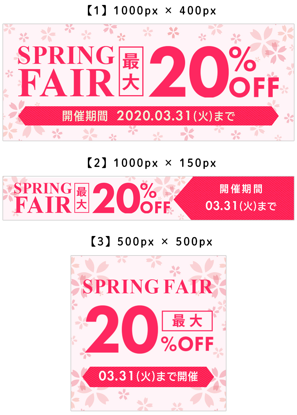 - 入れて欲しいワード「SPRING FAIR」「最大20%OFF」「開催期間:3/31まで」