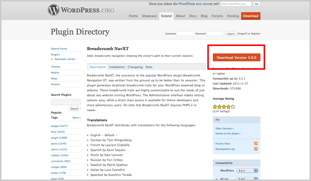 まずはhttp://wordpress.org/extend/plugins/breadcrumb-navxt/にアクセスしてBreadcrumb NavXTをダウンロードします。