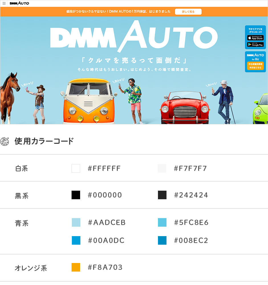 また、同じ水色でも背景に使用するカラーは車や人物の写真がカラフルな分淡く調整されています。写真を邪魔しない色合いになっていますよね。反対にテキストで使用するカラーは濃いものを選択することで、明るい色ですが可読性も充分です。