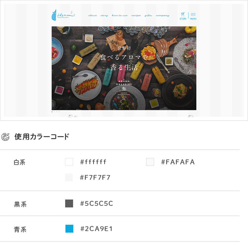 ロゴやナビゲーション、見出しなどに同じ水色を使用しているようです。使用しているカラーコードの数は多くないですが、単調になりすぎず、商品に合った雰囲気のホームページになっていますよね。