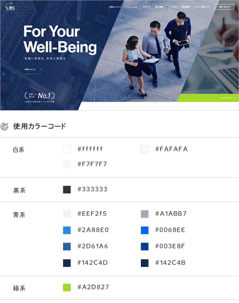メインカラーとして落ち着いた色合いのネイビー、コーポレートカラーの黄緑色を使用しています。