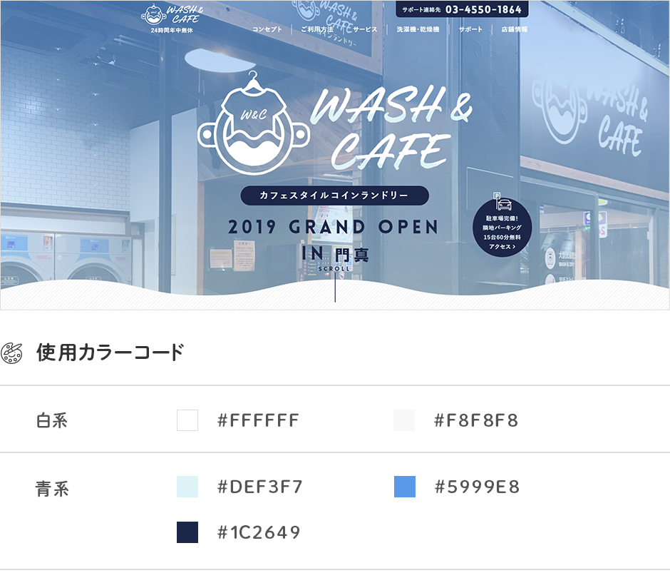カフェスタイルコインランドリー「WASH&CAFÉ」のホームページ。青系のカラーは水色、青、ネイビーと計3色を使用していました。
