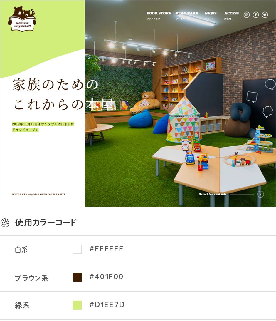 本を見ているクマの親子のロゴがかわいいですね。ロゴのカラーにあ合わせて、ホームページのメインカラーはブラウン×黄緑。
