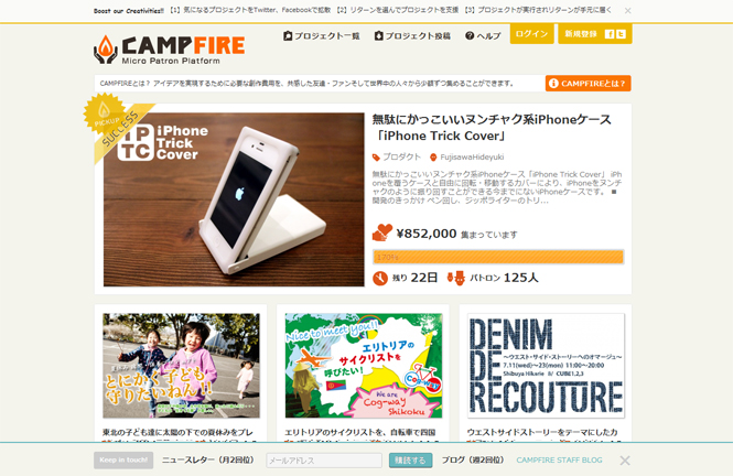 最近良く耳にするようになったクラウドファンディングのCAMPFIRE。デザインも見やすく、出資者を「パトロン」と呼ぶのも面白いですね。