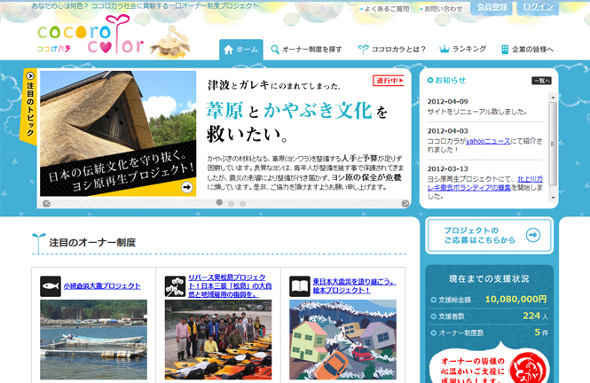 cocotocolor(ココロカラ)は、被災地を応援するクラウドファウンディング。ホームページの随所に見られる水彩のイラストが可愛いですね。
