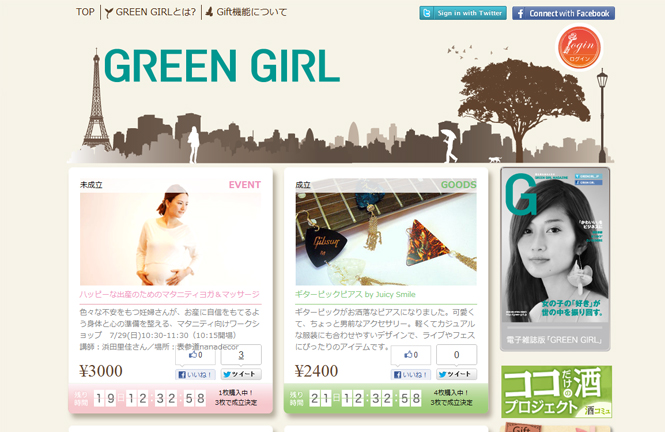 女性向けのクラウドファンディングサービスGREEN GIRL。女性的なデザインで落ち着きますね。