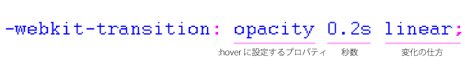 :hover 時に設定するプロパティ、秒数、変化の仕方、の順で設定していきます。