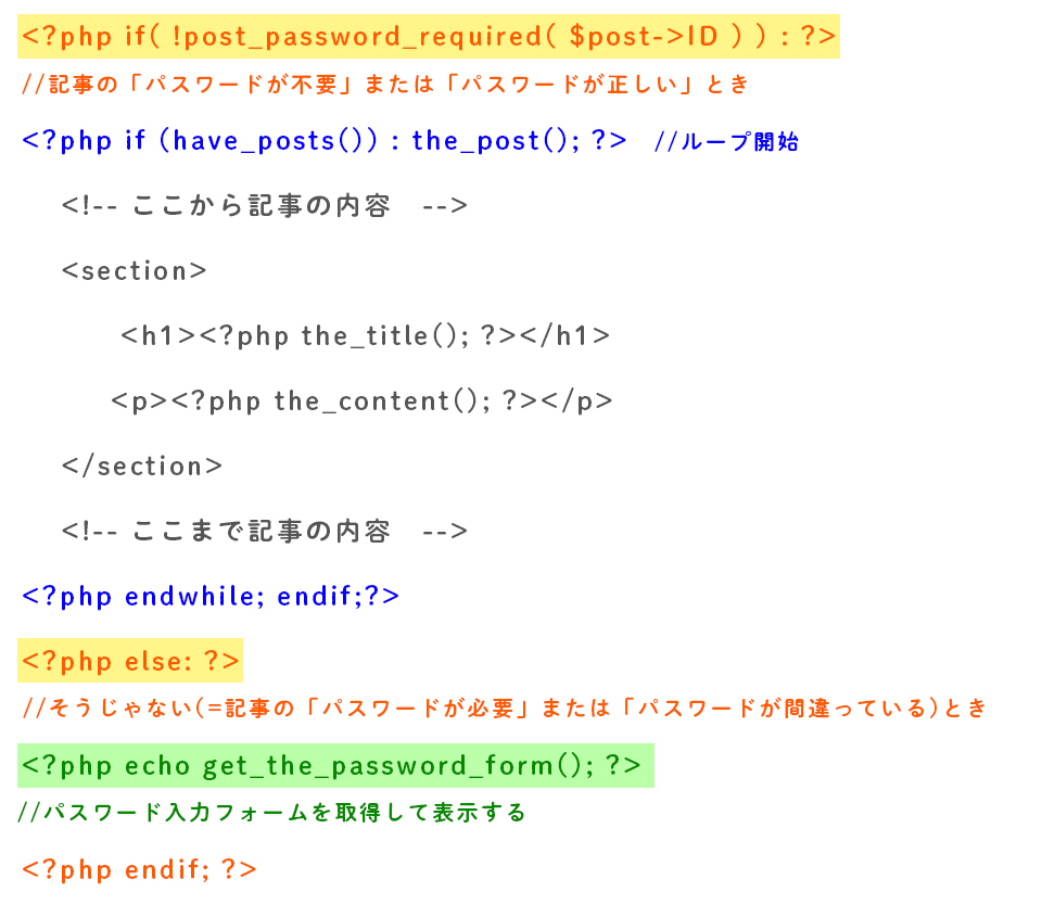 パスワード機能を有効にしたいsingle.phpに以下のようなコードを書くことで解決できます!