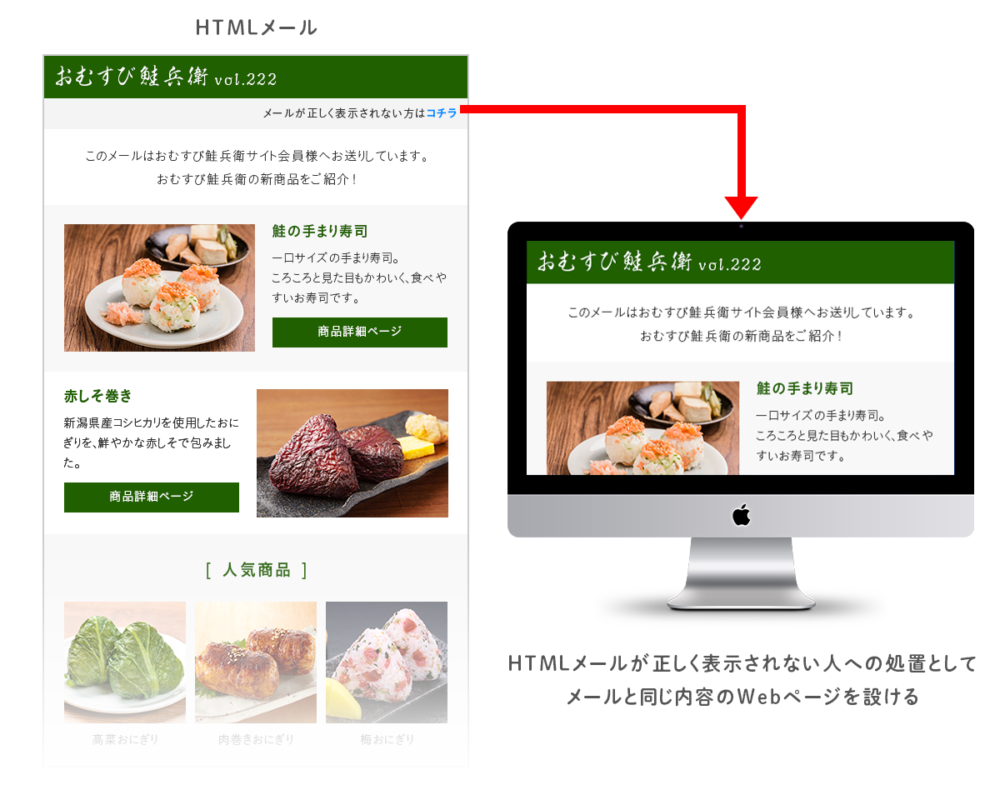 メール内の上部に「メールが表示されない方はこちら」のようなリンクを設置し、Web上で同じデザイン・内容を閲覧できるようにしておく方法です。