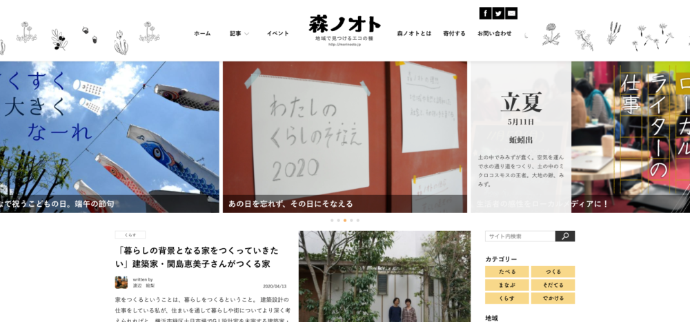 「森ノオト」は横浜市の青葉区に特化した地域メディア。ターゲットは青葉区に最近増えている子育て中のファミリー層だと思われます。掲載されているコンテンツも、子育てファミリーに向けた地元の活動に関するものがメインとなっています。
