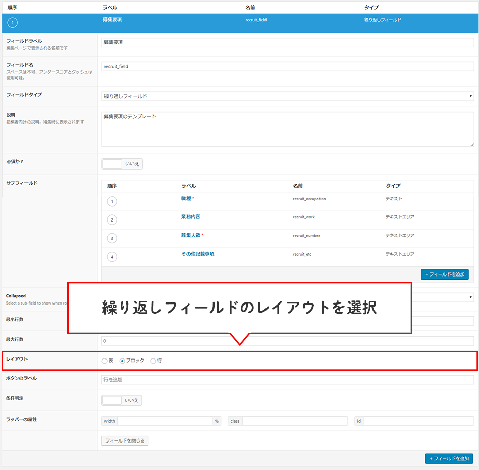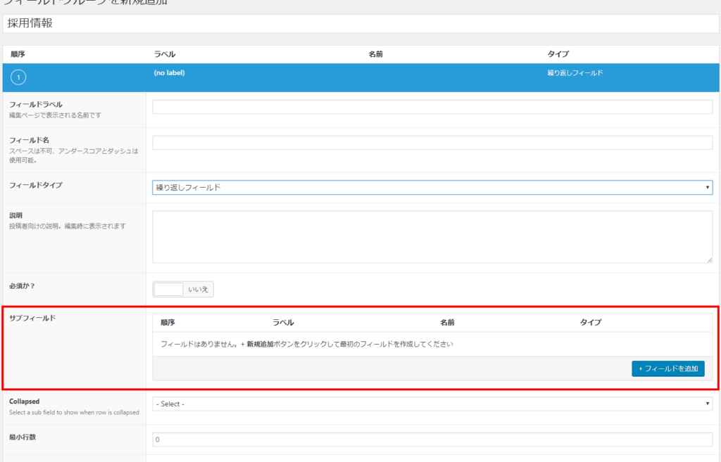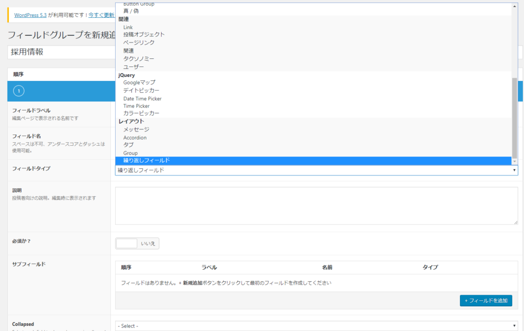 アドオン追加後、カスタムフィールドの「フィールドタイプ」の中に「繰り返しフィールド」という選択項目が出現しますのでまずはそちらを選択。