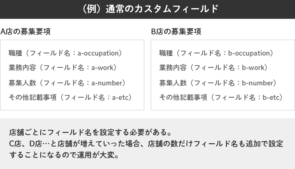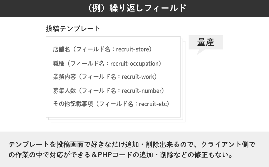 「項目内容は一緒だけど記入する中身が違う、投稿数も増えたり減ったりする可能性がある」といったときに大活躍してくれます。たとえば採用情報や店舗情報など。