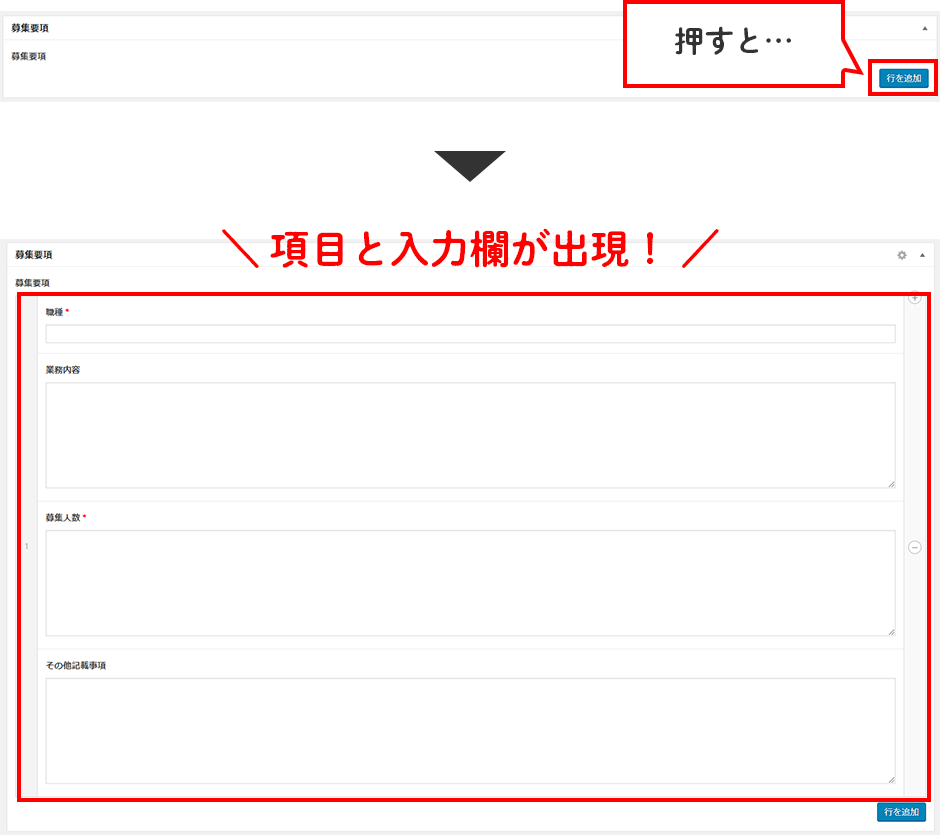 画面右下に「行を追加」というボタンがあると思いますのでそこをクリックすると、「募集要項」のブロックが1つ出現します。