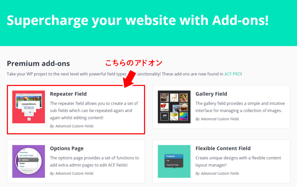 繰り返しフィールドは、ACF Proというアドオン込みの有料プラグイン(ACF+色々な有料アドオンが使えるセットみたいなもの)か、アドオンの単独購入で使用が可能になります。