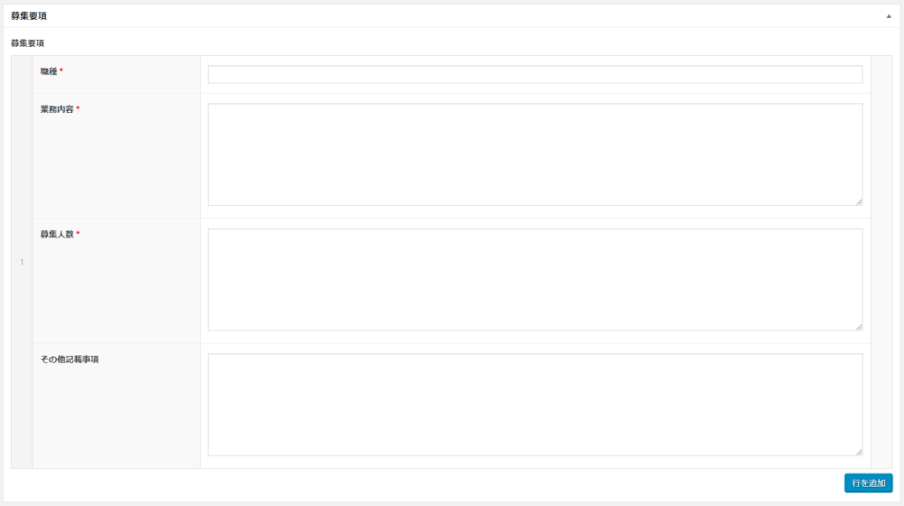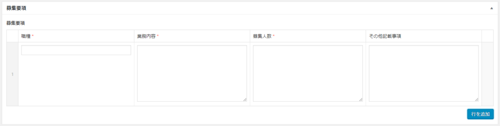 画面右下に「行を追加」というボタンがあると思いますのでそこをクリックすると、「募集要項」のブロックが1つ出現します。