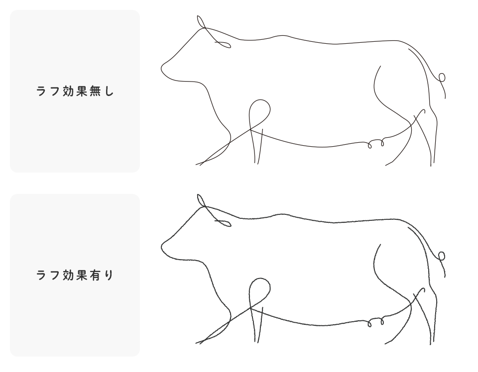 「線のラフさ」は、鉛筆でささっと描いたような柔らかさをちょっとだけ出したいと思いラフの効果を加えました。