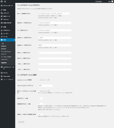 設定画面では1ページあたりに表示させる記事数や、「前のページ用テキスト」「次のページ用テキスト」などの表記を編集することができます。