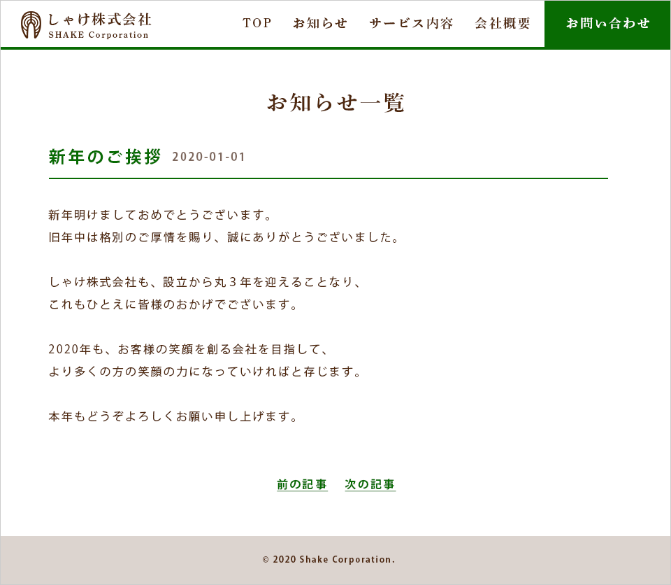 - お知らせ詳細を想定してページ(single.php)を作成し、ひとつ前/後の投稿記事へのページリンクを設置