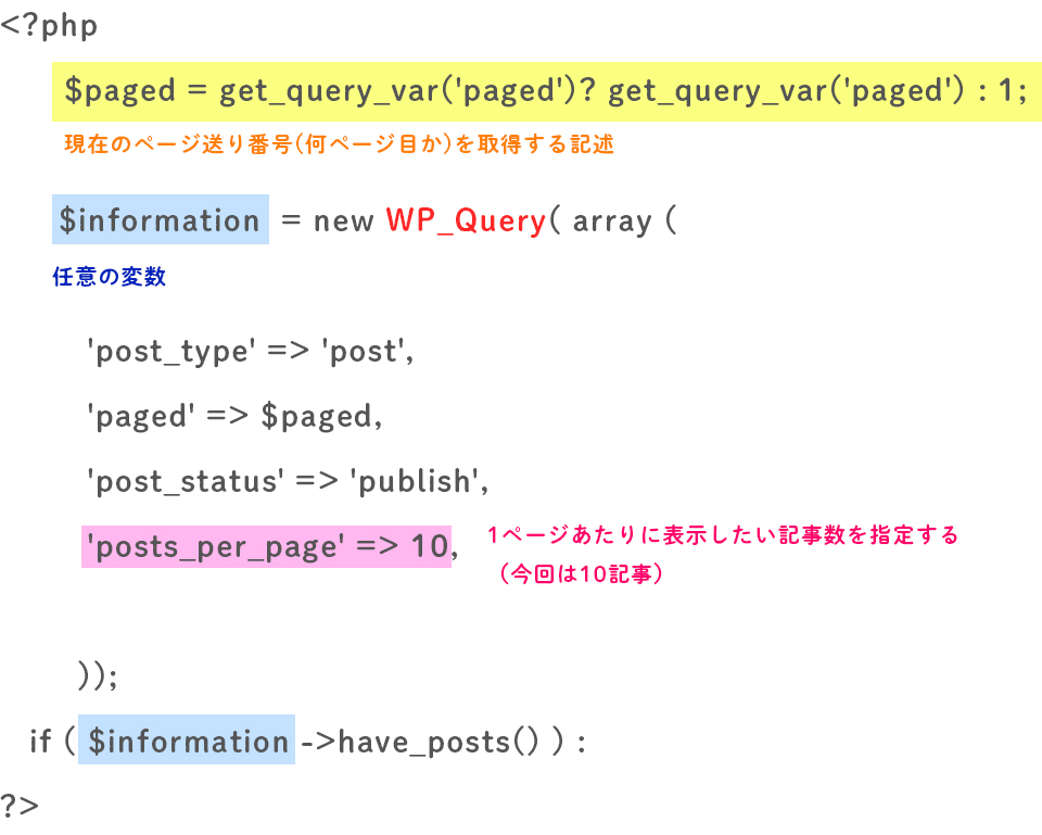 【POINT】 「 ‘posts_per_page’ => ●●」と、管理画面で設定した数字を同じにしておく